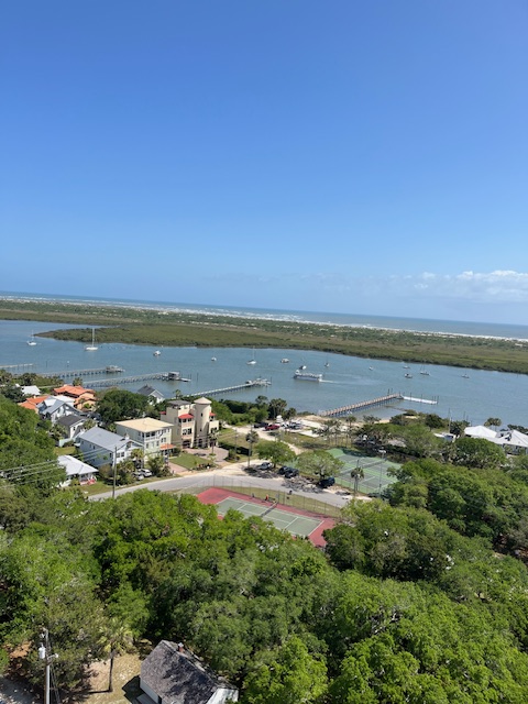 Whenever I mention the lighthouse in St. Augustine, Florida, on Anastasia Island, I know immediately if that person has been there. Gasps of “Now that’s a climb” or some variation usually occur. The 209 steps appear daunting, and it can seem as if the winding spiral staircase is never going to end , but suddenly it does, and the 165-foot climb is all but forgotten. It’s a little bit like giving birth. It’s labor intensive getting to the top, but once there and walking around 360-degree balcony, the climb is all but forgotten.